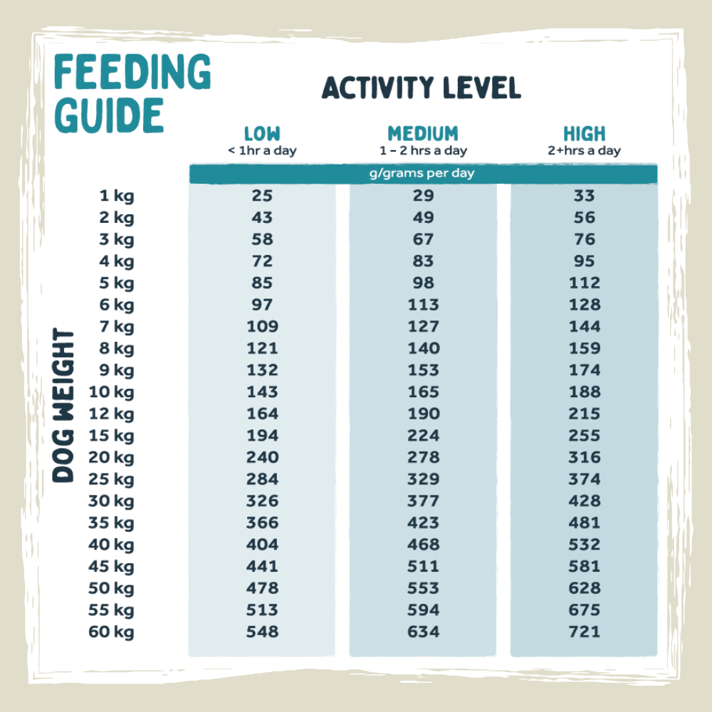 Please use this information as a guide. Your dog’s breed, condition and activity levels should also be considered as well as regular weight monitoring to adjust feeding quantities as required. If you are unsure, please check with your vet.