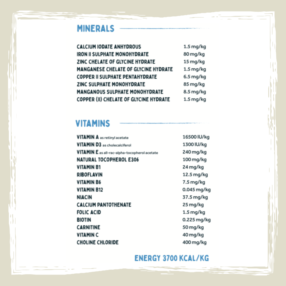 Crude protein 28%, crude fat 12%, crude fibre 3.5%, raw ash 7%, calcium 1.2%, phosphorus 0.9%.