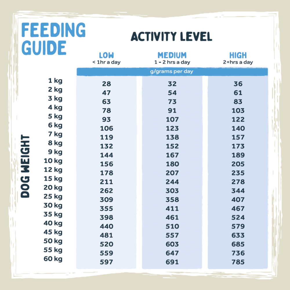 Please use this information as a guide. Your dog’s breed, condition and activity levels should also be considered as well as regular weight monitoring to adjust feeding quantities as required. If you are unsure, please check with your vet.