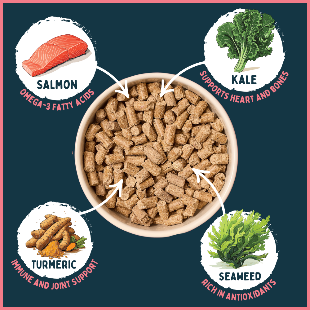 Goes down swimmingly! Our super popular award winning Salmon Cold Pressed recipe is a powerhouse of natural goodness for your dog. It delivers essential omega fatty acids to support health and wellbeing. Is blended with Kale, turmeric and seaweed to support bones, promote heart health, provide immune support and give an antioxidant boost.