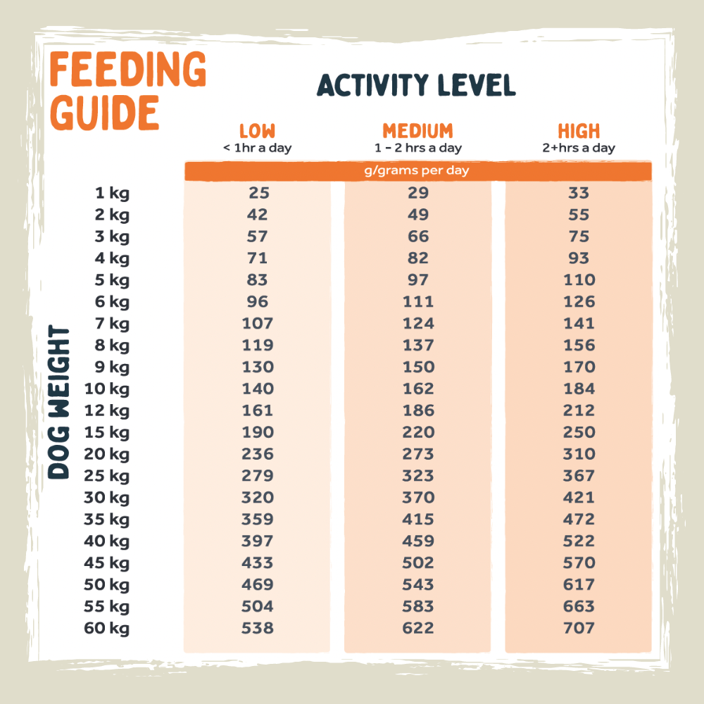 Please use this information as a guide. Your dog’s breed, condition and activity levels should also be considered as well as regular weight monitoring to adjust feeding quantities as required. If you are unsure, please check with your vet.