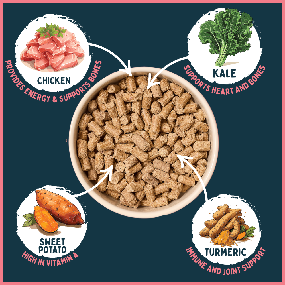 Dried ground chicken (30%), sweet potato (28.5%), peas (25.5%), chicken hydrolysate (6%), chicken oil (3%), beet fibre (2%), carrot (1%), kale (0.5%), apple (0.5%), seaweed, (0.5%) pea fibre (0.5%), postbiotic - inactivated yeast saccharomyces cerevisiae (4 g/kg) (0.4%), vitamins and minerals (1.8%), chicory, inulin, DL-methionine (530 mg/kg), prebiotic - mannan-oligosaccharides (500 mg/kg), glucosamine (400 mg/kg), chondroitin sulphate (300 mg/kg), yucca schidigera, natural antioxidants (tocopherol extracts and rosemary extract), L-tryptophan, thyme, carnitine (50 mg/kg), cranberry, dandelion root, marigold yellow, ginger, turmeric.
