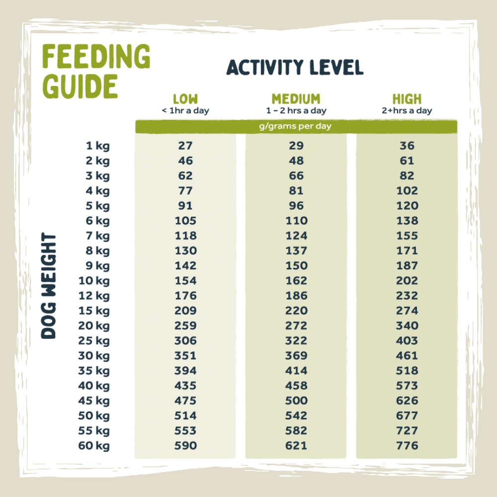Please use this information as a guide. Your dog’s breed, condition and activity levels should also be considered as well as regular weight monitoring to adjust feeding quantities as required. If you are unsure, please check with your vet.