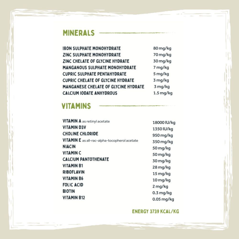 Crude protein 25.5%, crude fat 10%, crude fibre 2.8%, raw ash 7.5%, calcium 1.2%, phosphorus 0.74%.