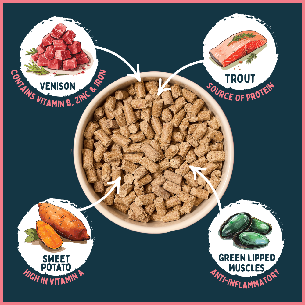 Posh surf and turf. Our award winning venison and trout recipe is blended with sweet potato, seaweed and green-lipped mussel. Venison is a lean meat which is rich in naturally occurring vitamin B, zinc and iron. Trout is a delicious source of protein and green-lipped mussels act as a natural anti-inflammatory.