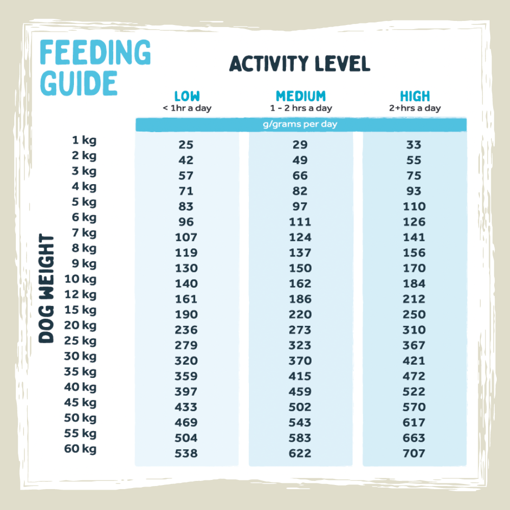 Please use this information as a guide. Your dog’s breed, condition and activity levels should also be considered as well as regular weight monitoring to adjust feeding quantities as required. If you are unsure, please check with your vet.