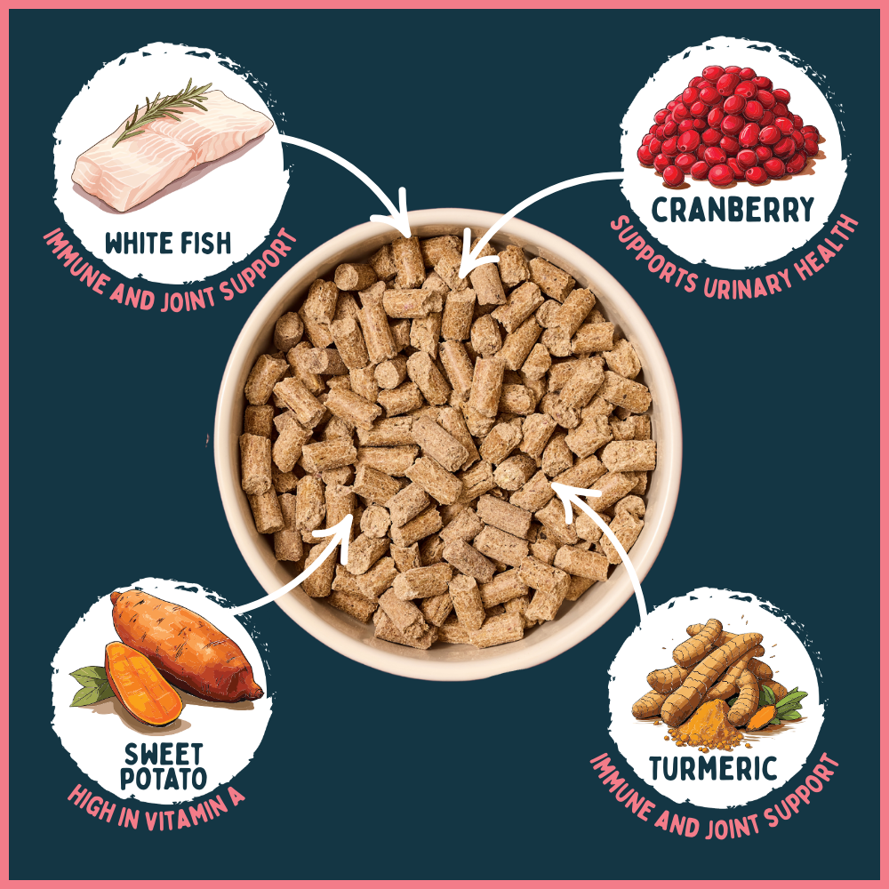 Dried ground white fish (29.5%), sweet potato (28.5%), potato flakes (27.5%), hydrolysed fish (5%), beet pulp (2%), rapeseed oil (1.5%), fish oil (1.5%), carrot (1%), spirulina (0.5%), seaweed (0.5%), kale (0.5%), postbiotic - inactivated yeast saccharomyces cerevisiae (4 g/kg) (0.4%), vitamins and minerals (1.7%), green-lipped mussel (0.25%), DL-methionine (500 mg/kg), prebiotic - mannan-oligosaccharides (500 mg/kg), glucosamine (400 mg/kg), chondroitin sulphate (300 mg/kg), yucca schidigera, chicory, inulin, cranberry, carnitine (50 mg/kg) dandelion root, marigold yellow, lutein, natural antioxidants (tocopherol extracts and rosemary extract), ginger, turmeric, thyme.